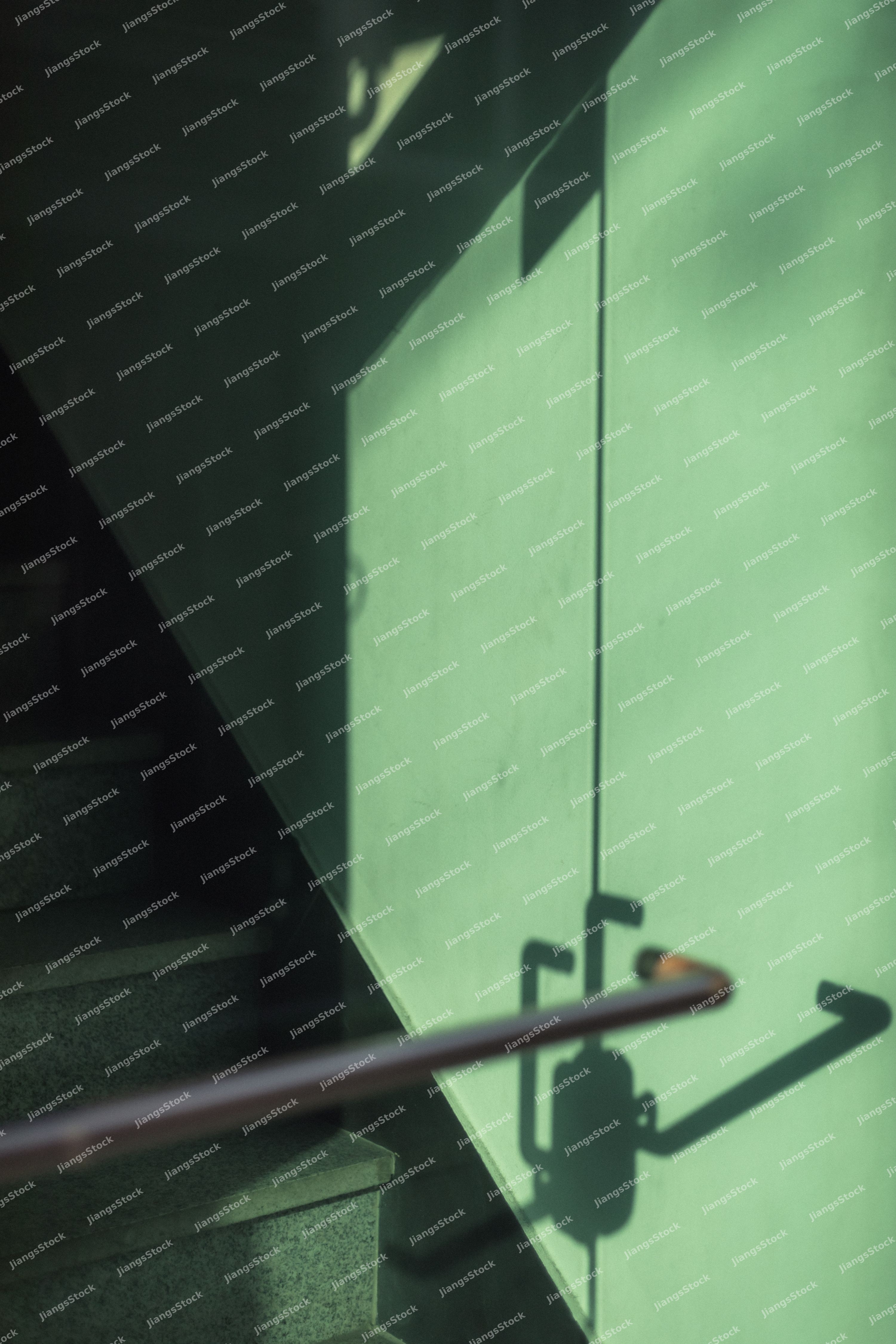Close-up of a metal door handle and locking mechanism on a light green industrial or institutional door with dramatic shadows and moody lighting.